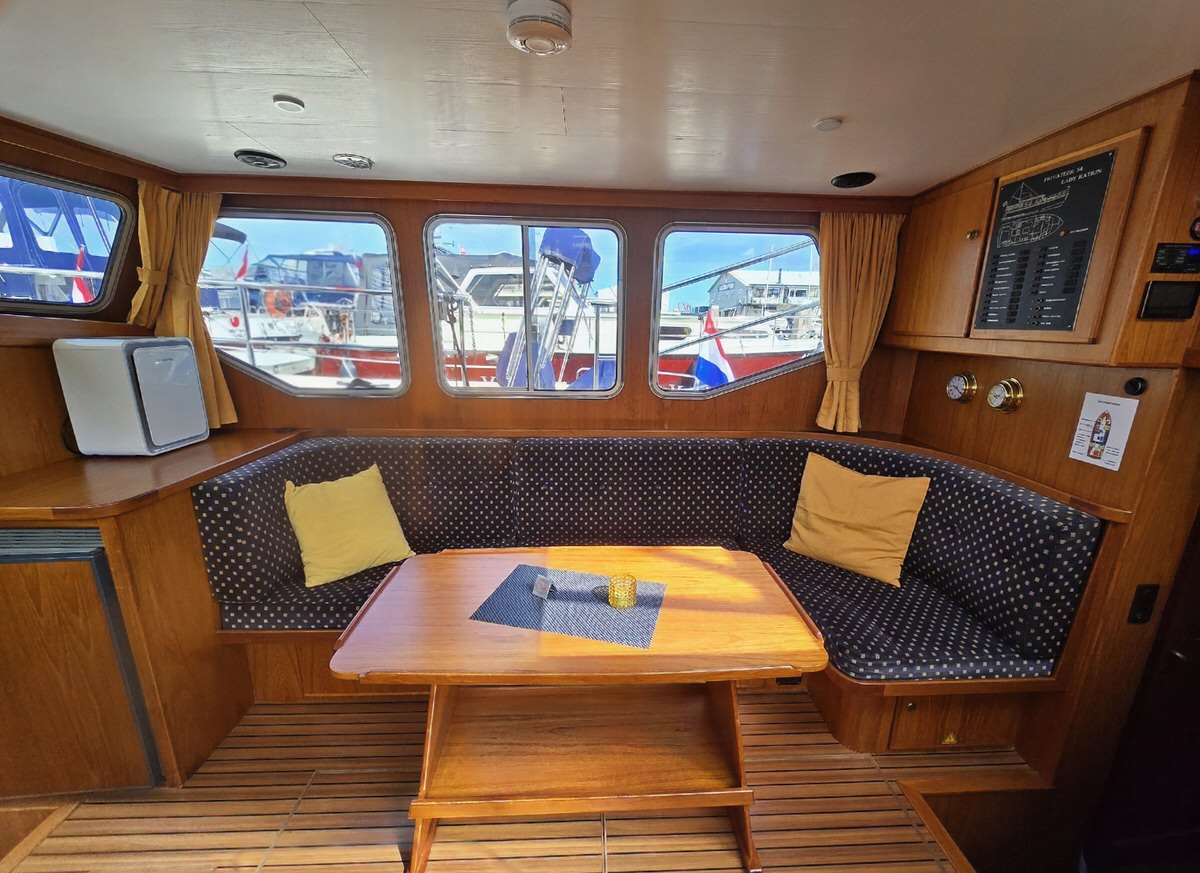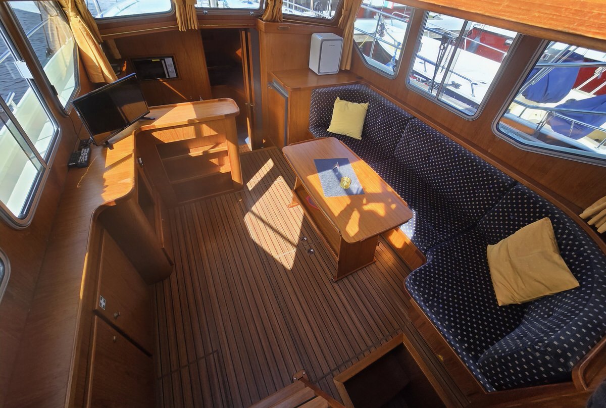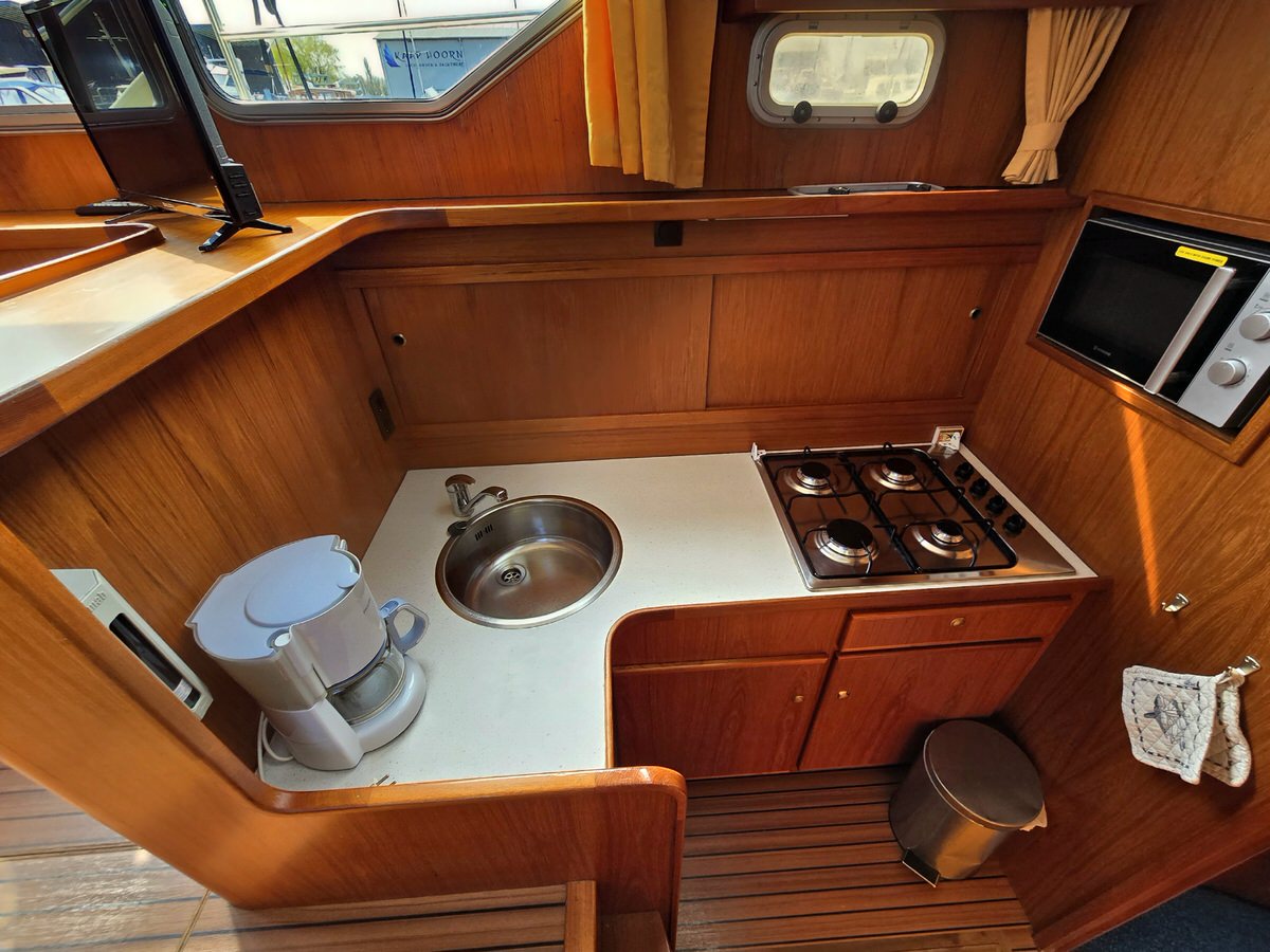 De salon, met royale bank en kastenwand, staat in open verbinding met de kombuis. De kombuis is compleet ingericht met een 4-pits gasstel, koelkast, magnetron, koffiezetapparaat, waterkoker en complete inventaris voor 4 personen.