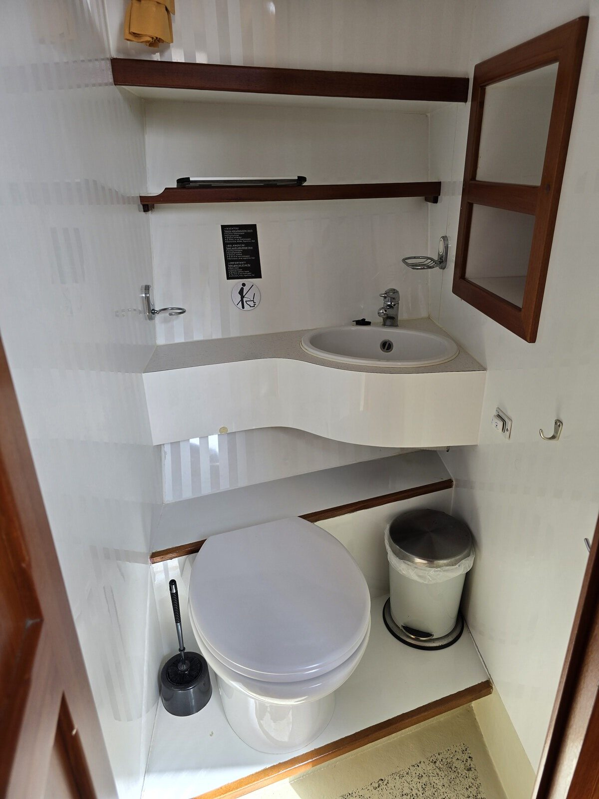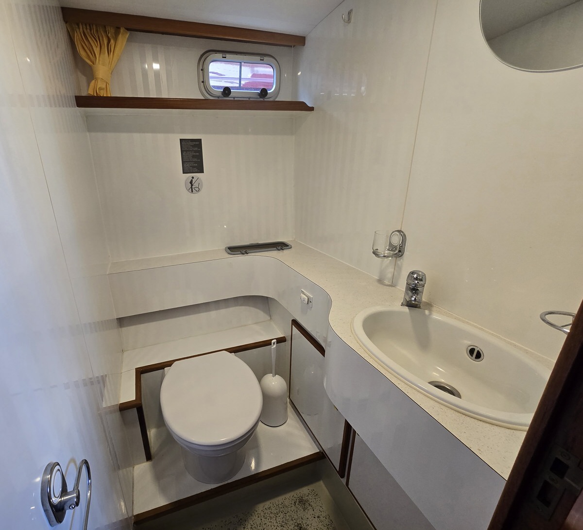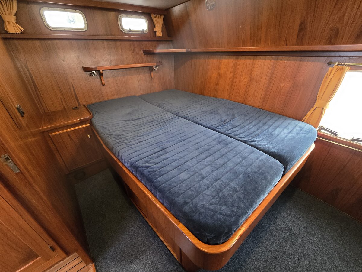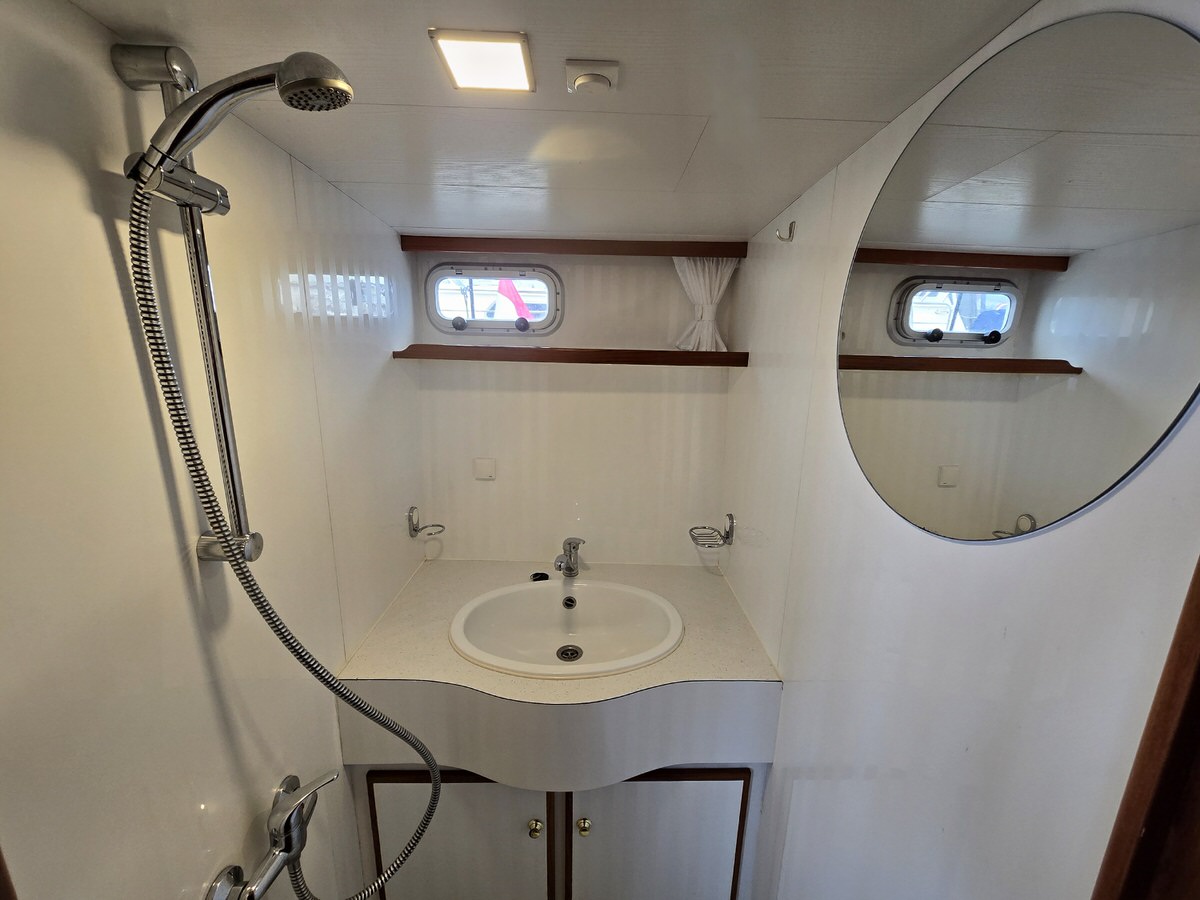 In het achterschip bevindt zich een afgesloten slaapcabine met half vrijstaand 2-persoonsbed met lattenbodem, een toiletruimte met elektrisch toilet en wastafel en een separate douche.