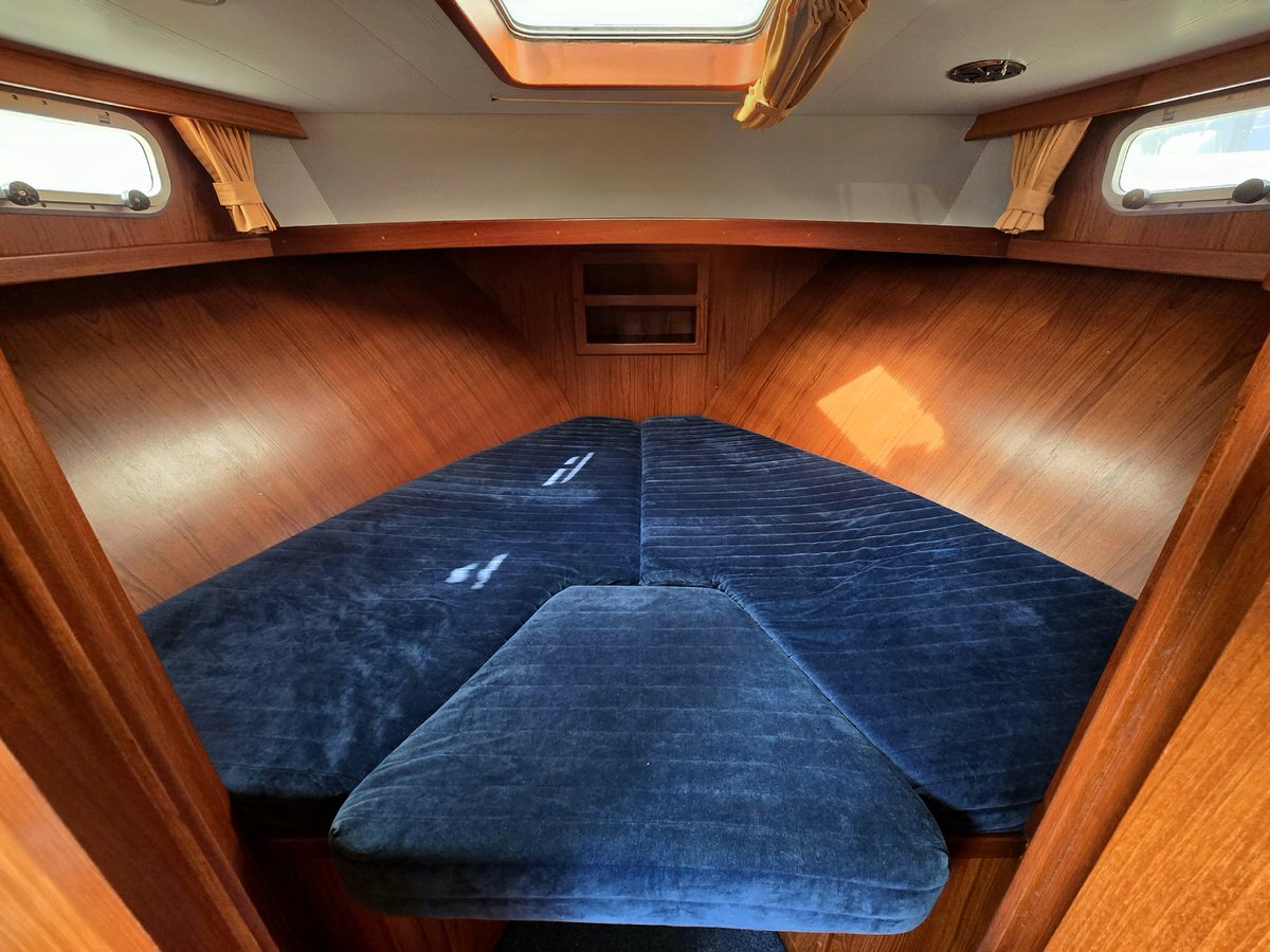 In het voorschip bevindt zich een afgesloten slaapcabine met voldoende kastruimte en een V-bed met lattenbodem, welke met een tussenstuk eenvoudig een 2 persoonsbed wordt. Verder een elektrisch toilet met wastafel.